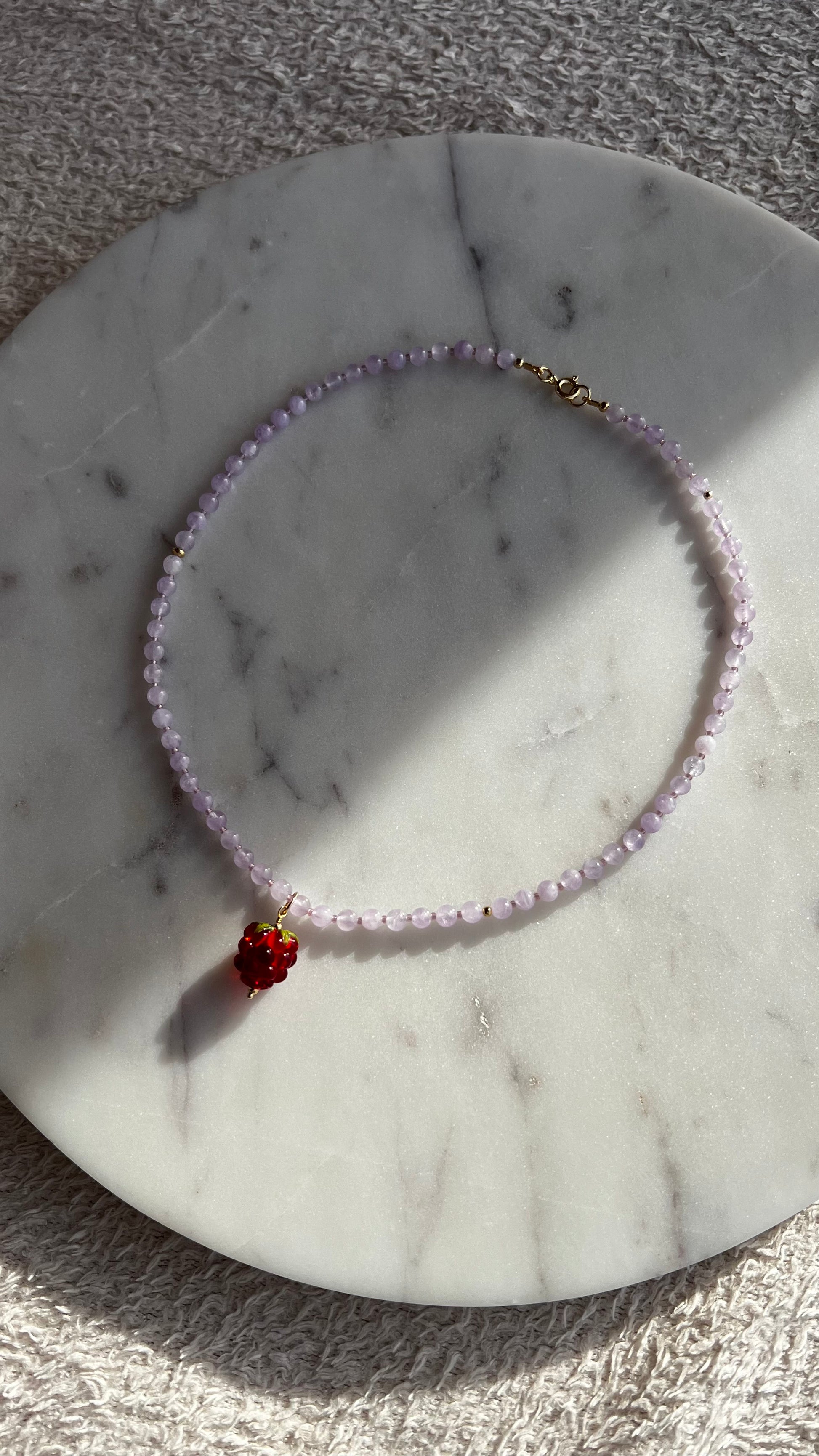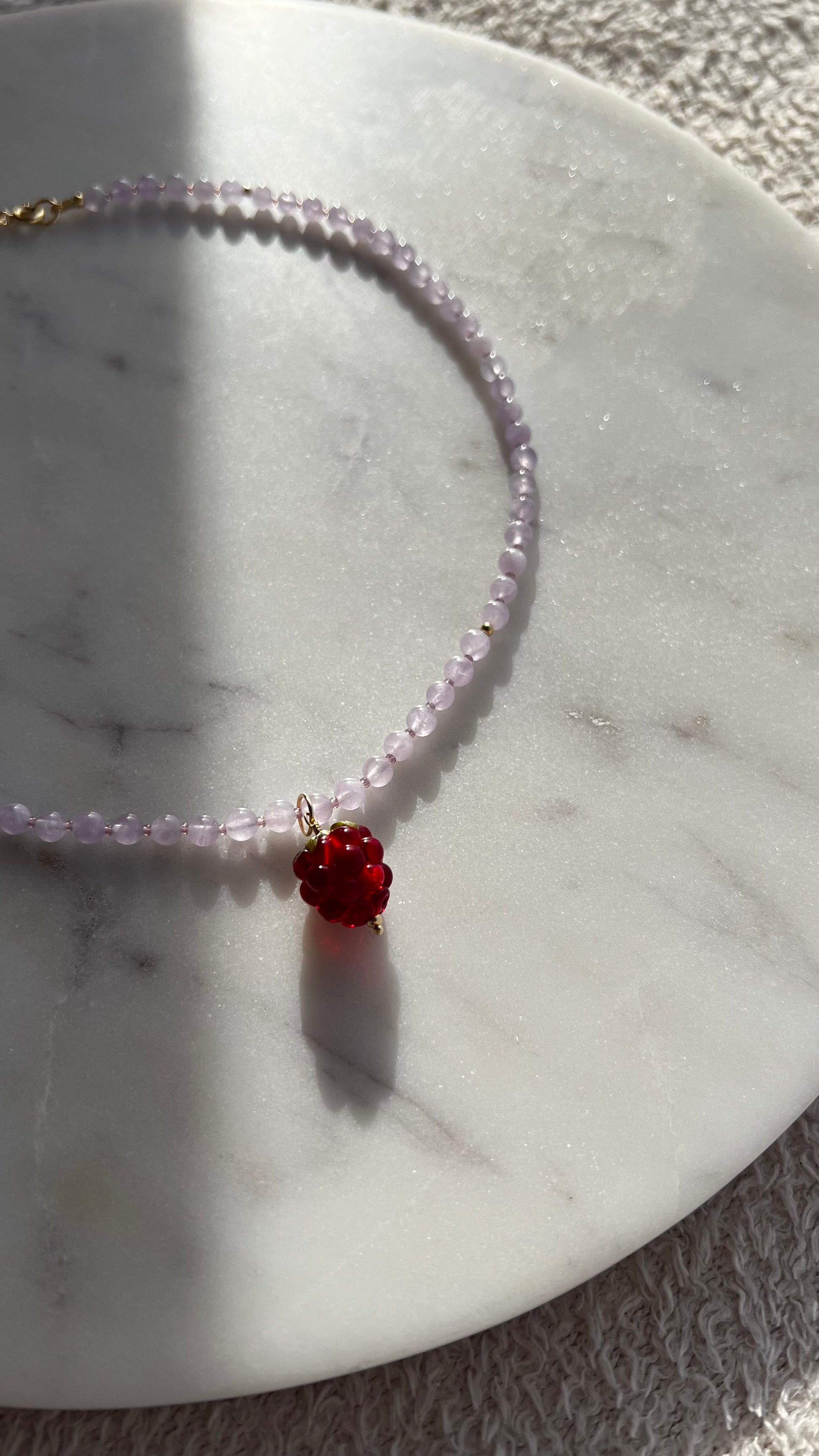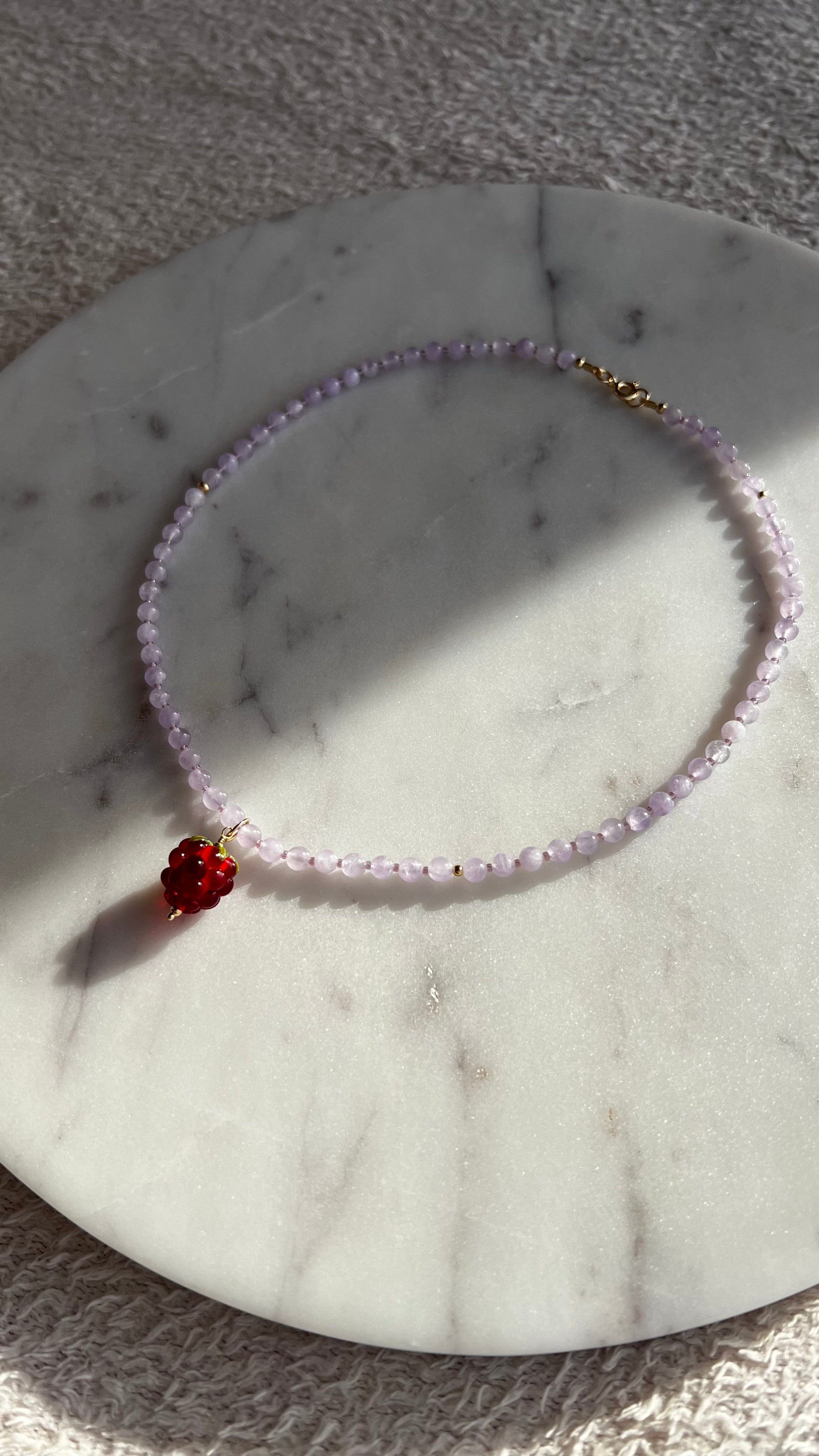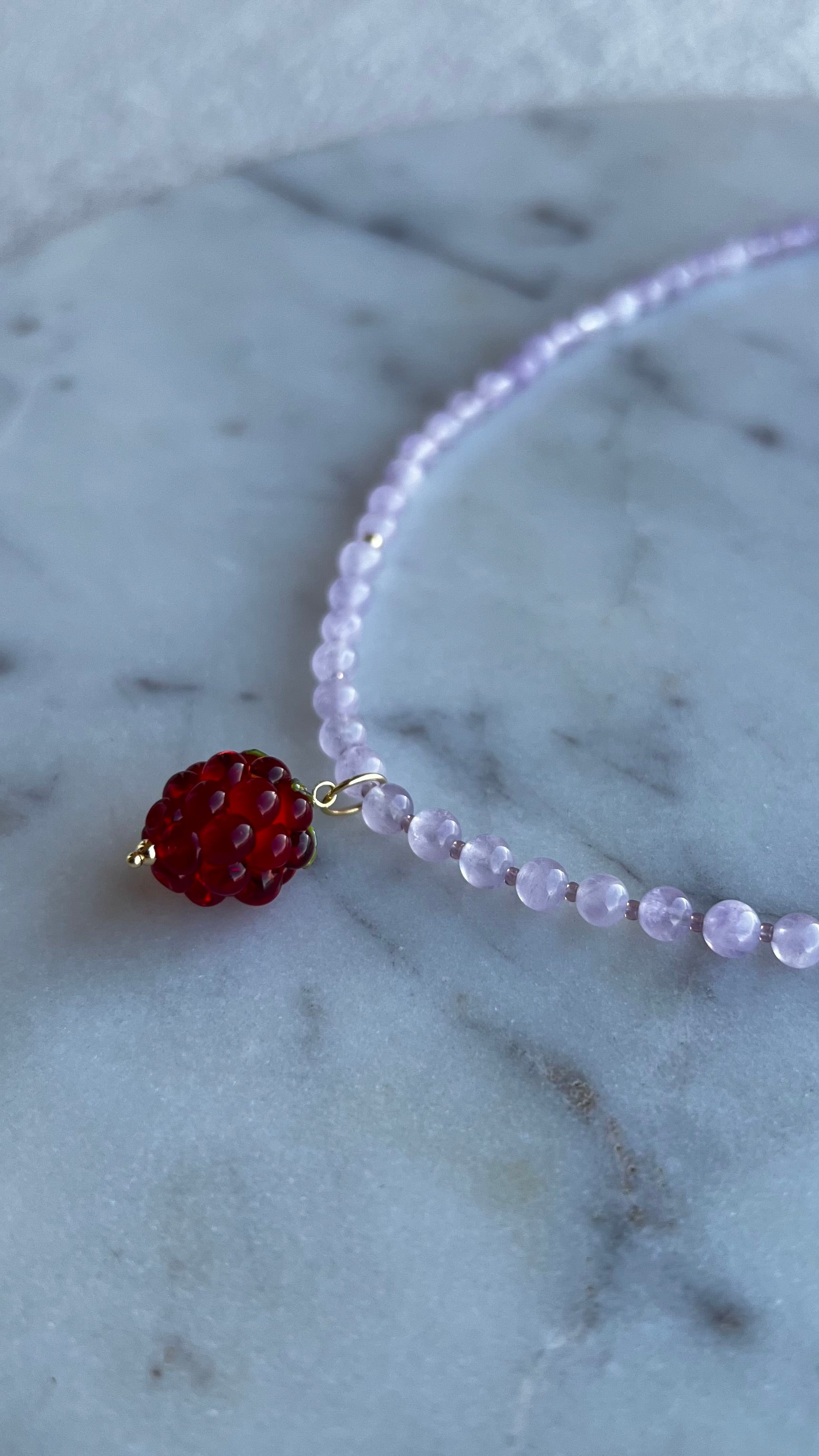 Delikatny naszyjnik wykonany z naturalnych kamieni ametystu, ozdobiony uroczą, szklaną czerwoną maliną tworzoną metodą lampwork. Idealny dla miłośniczek subtelnych, letnich detali i biżuterii z nutą vintage.