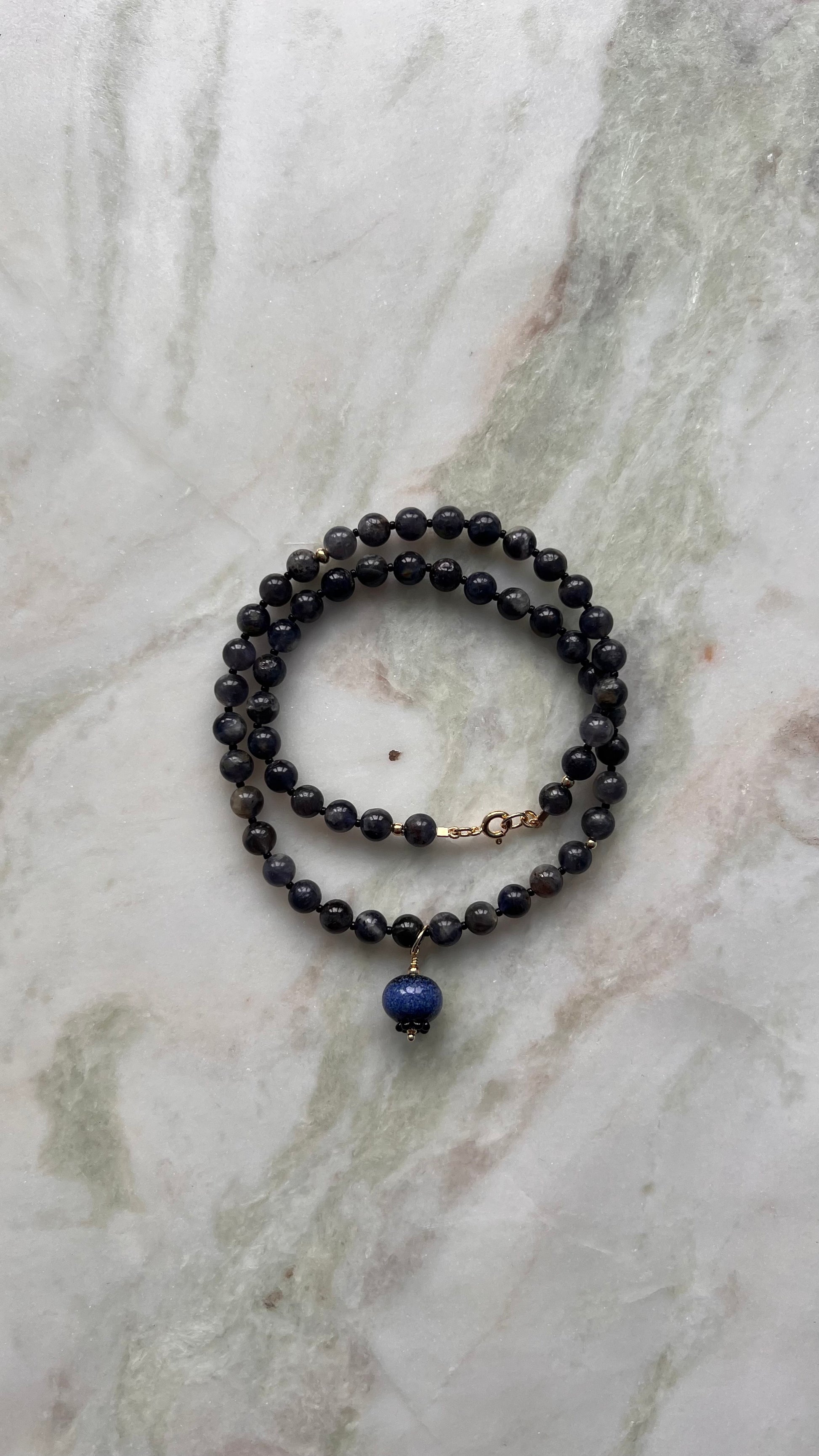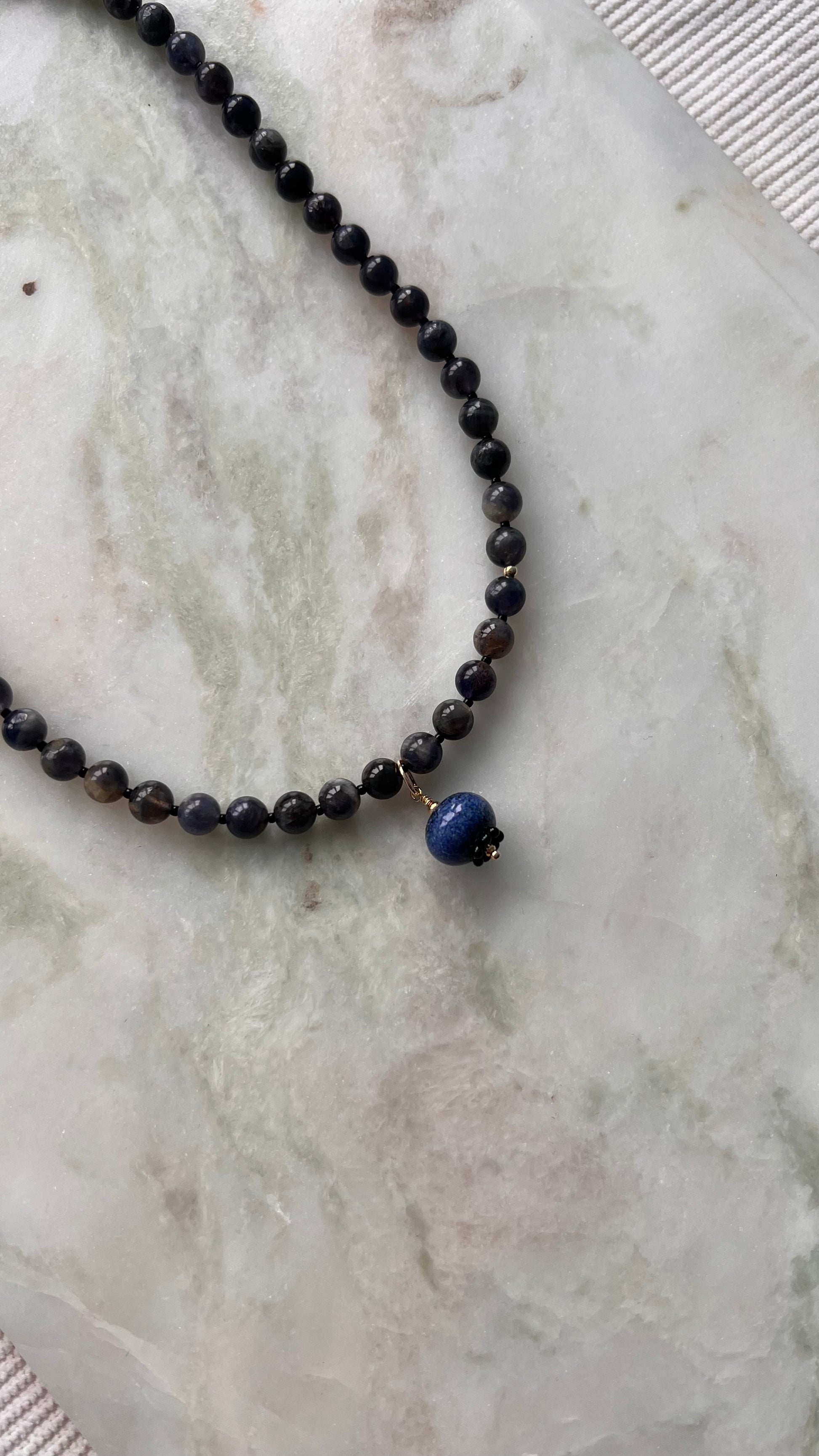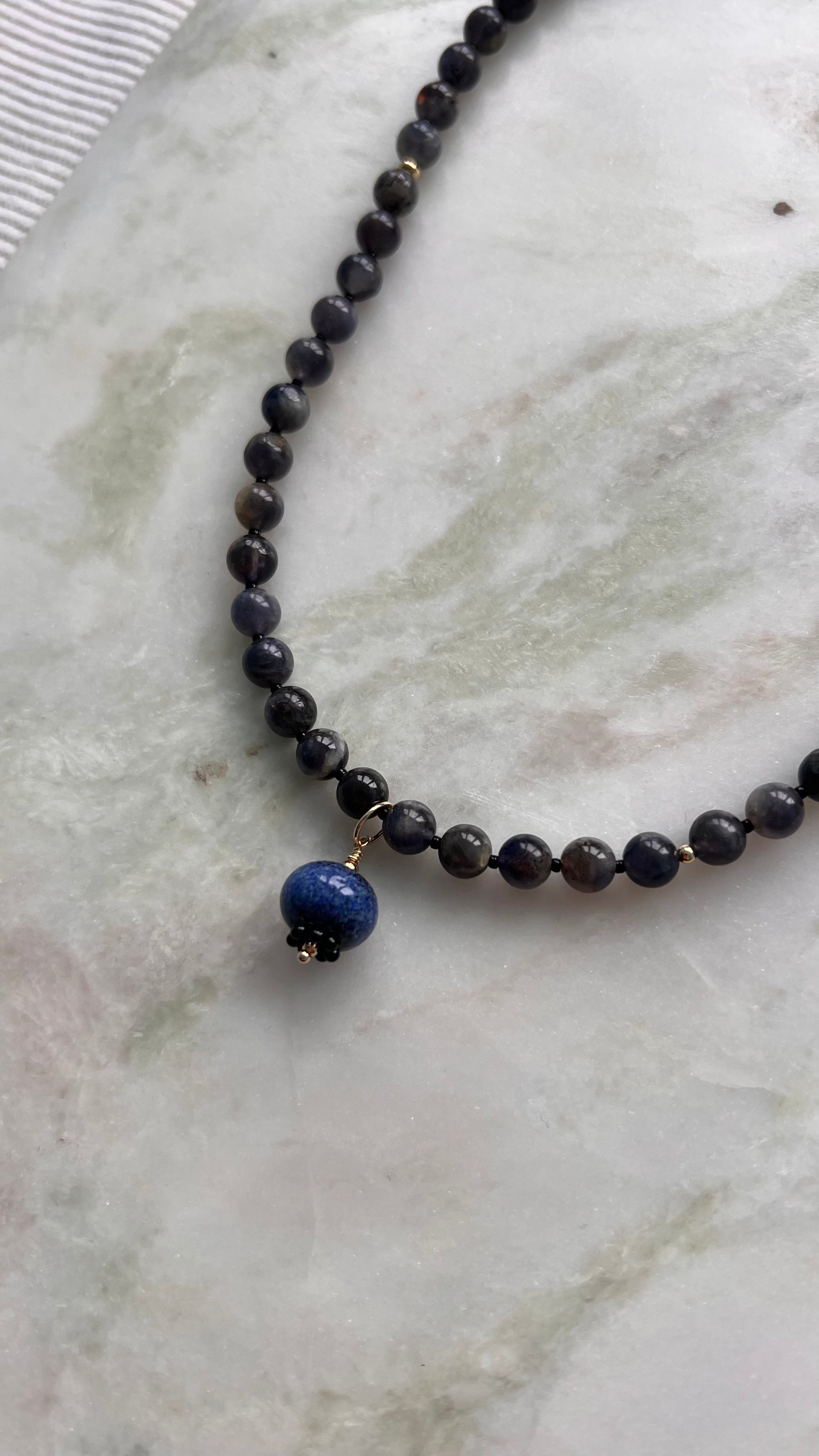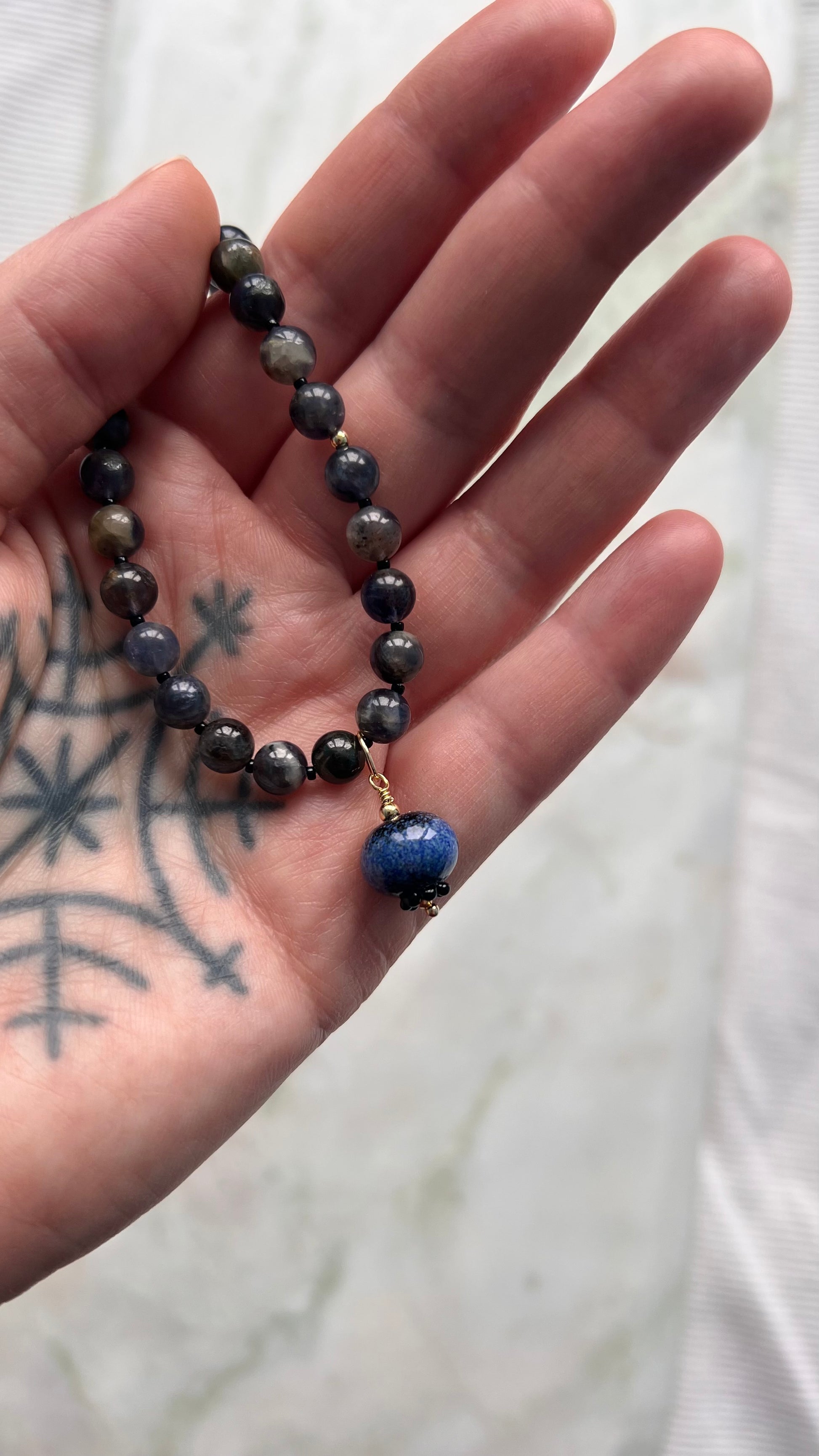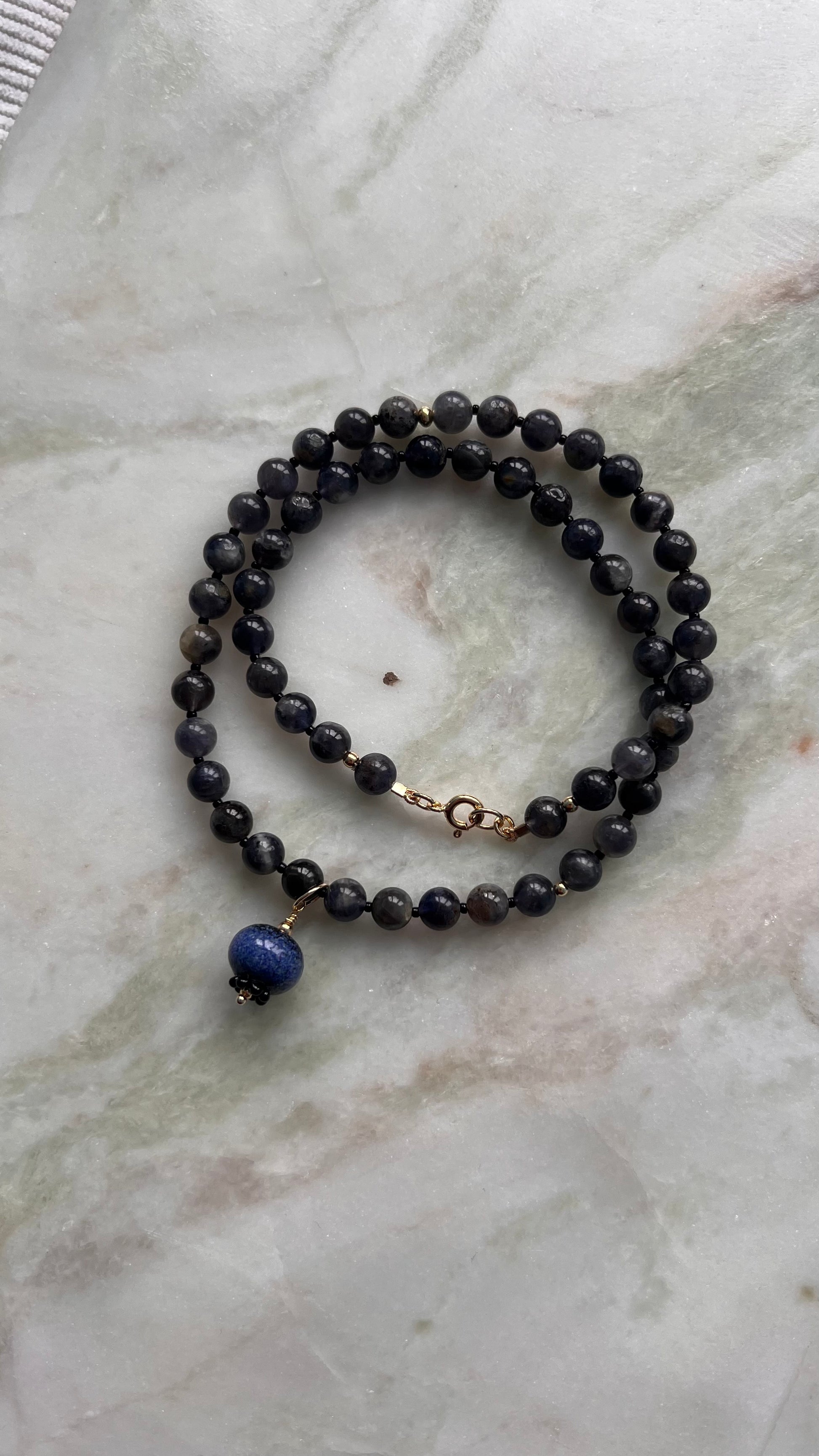 Ręcznie wykonany naszyjnik z naturalnego iolitu – znanego jako szafir wodny – w formie gładkich kulek o średnicy 6 mm. Kamienie zostały subtelnie przełamane drobnymi szklanymi koralikami, które dodają lekkości i delikatnego połysku.
