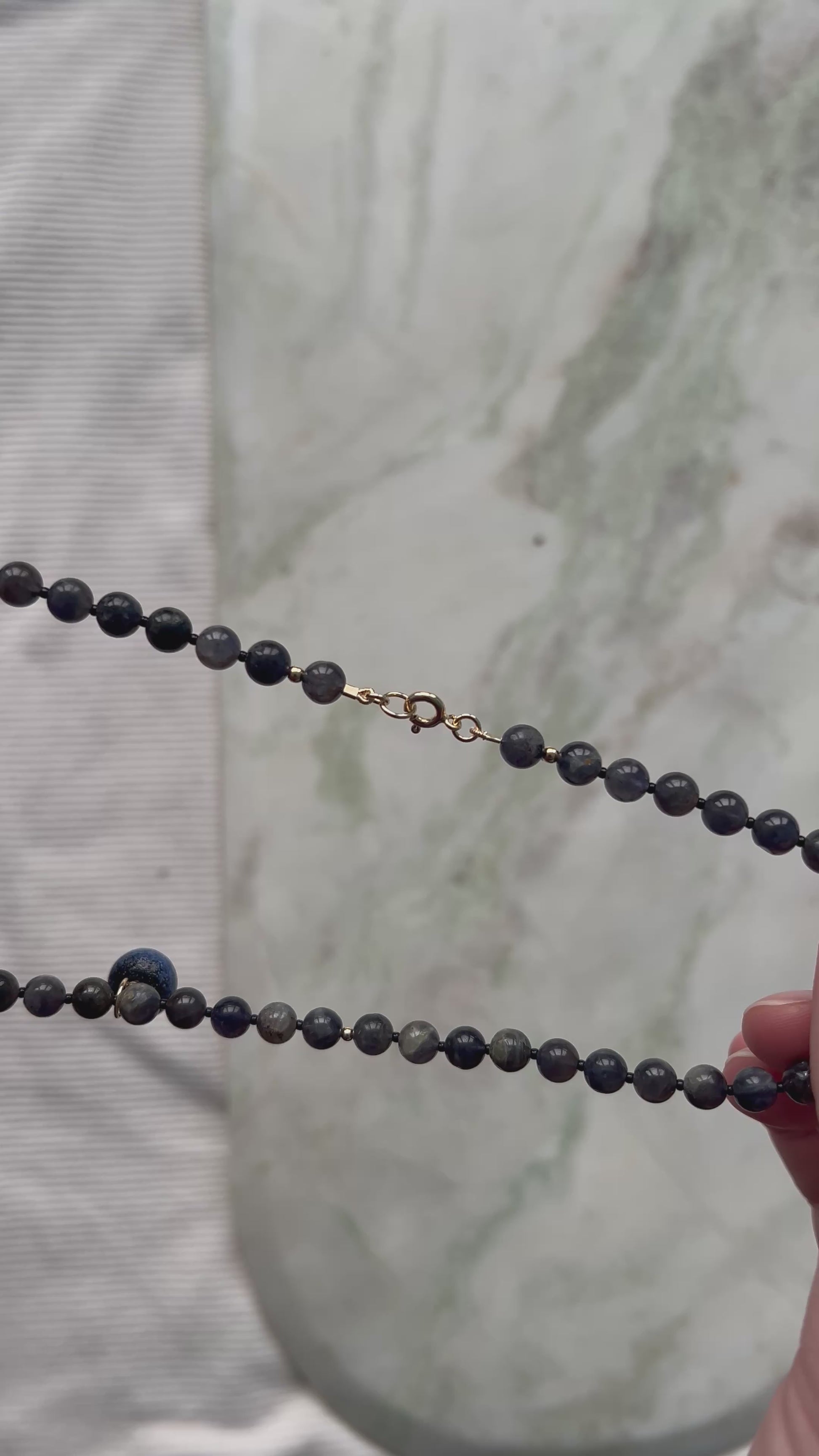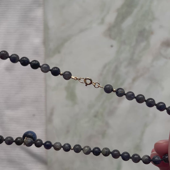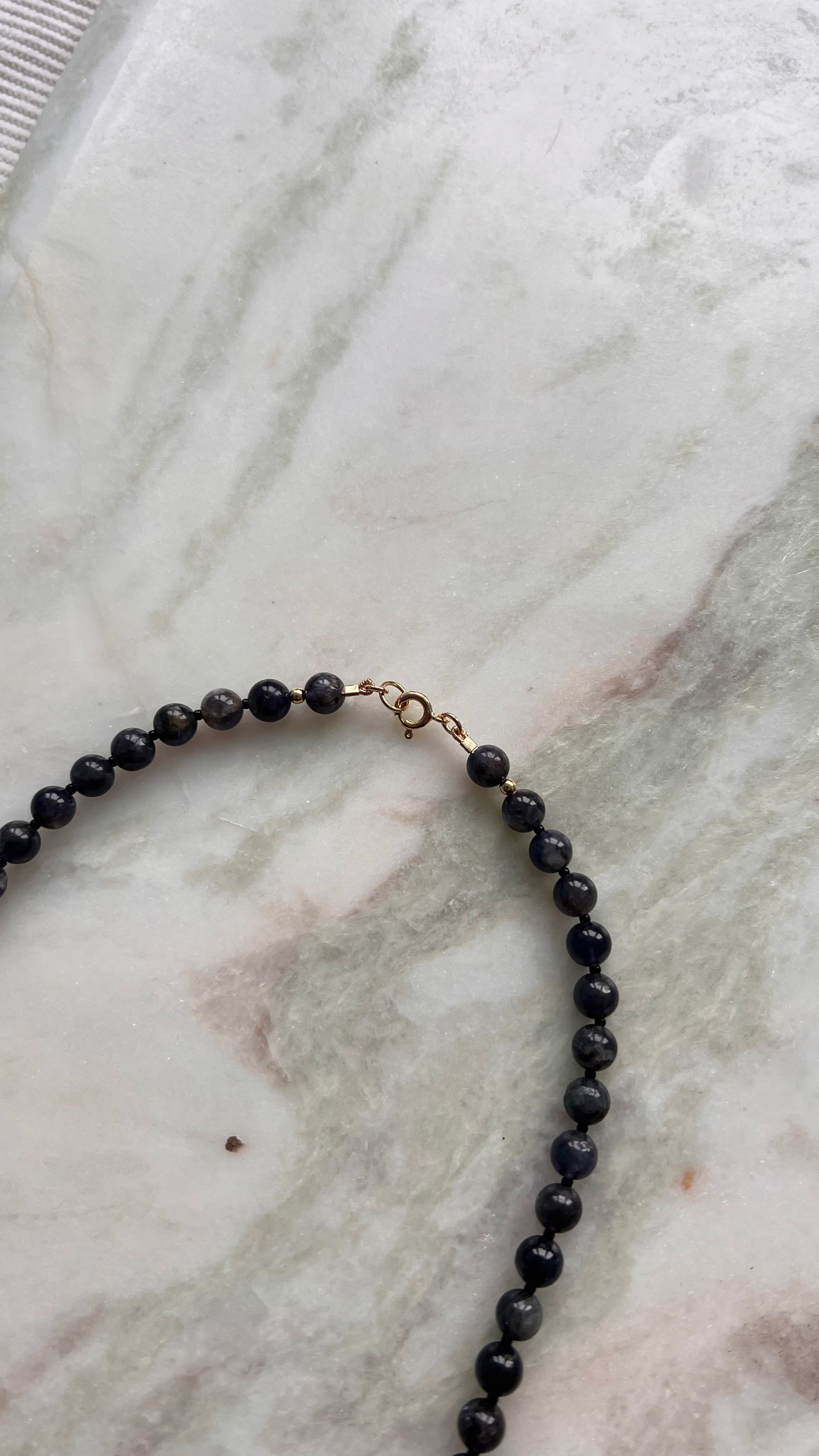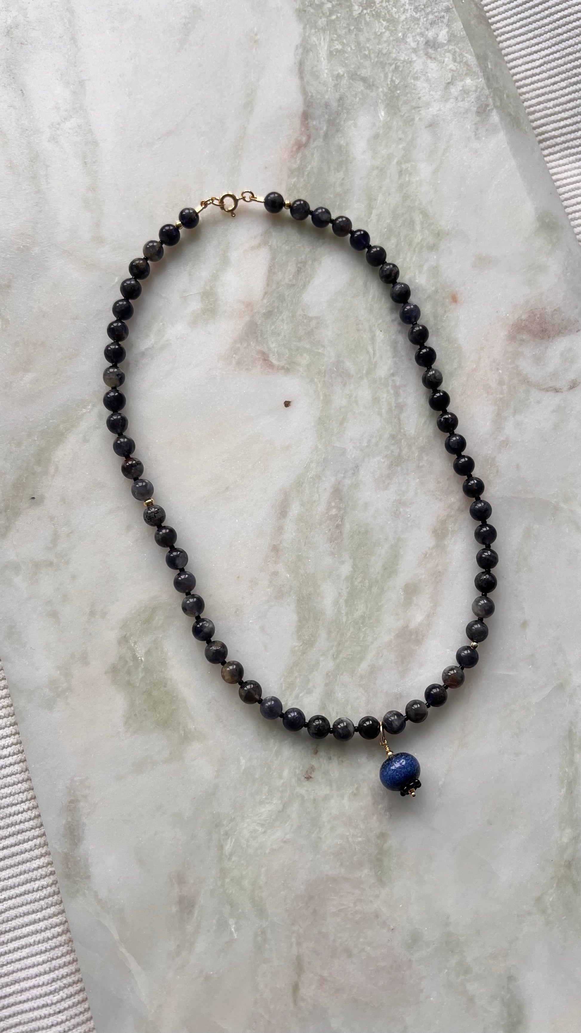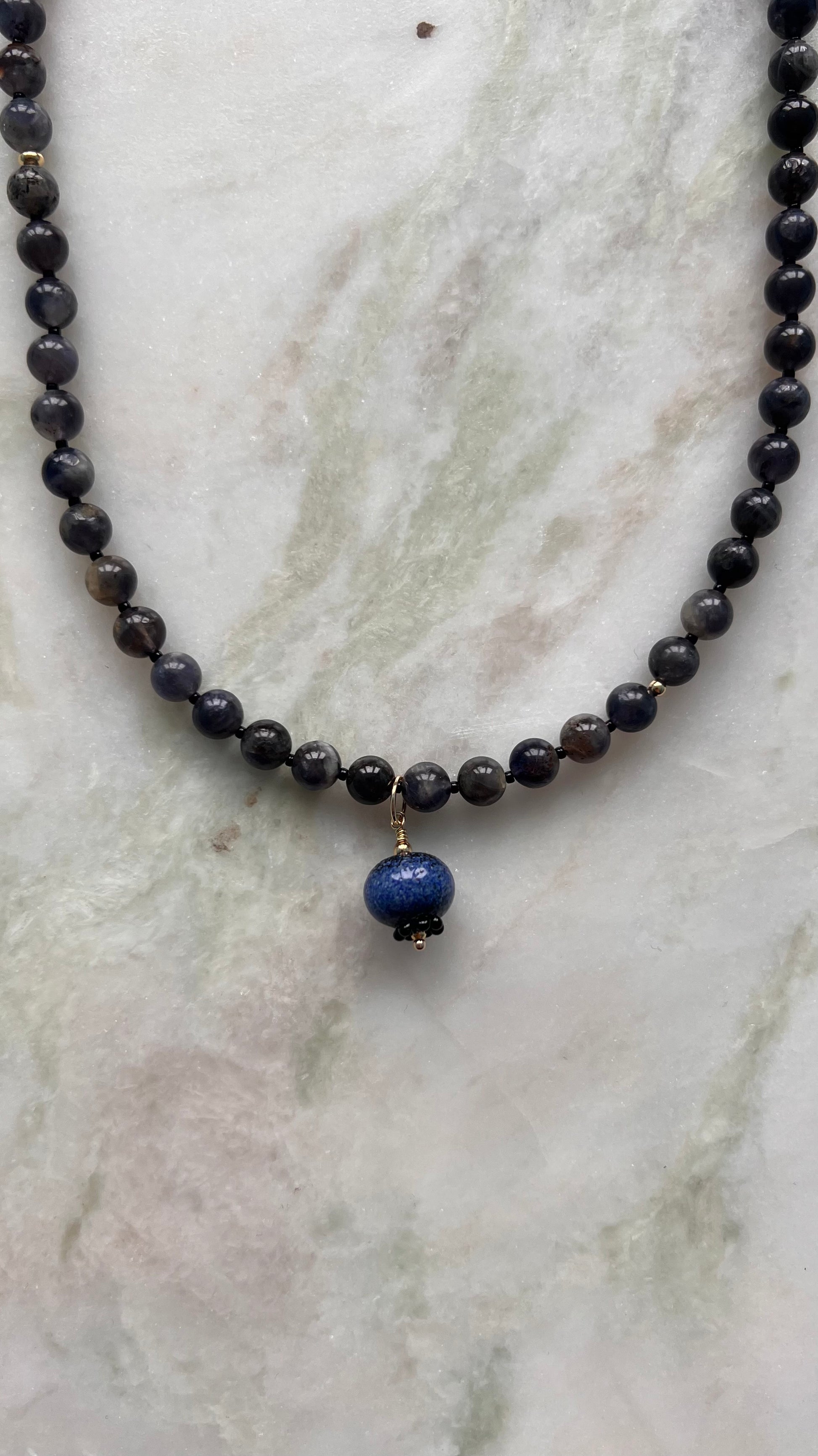 Ręcznie wykonany naszyjnik z naturalnego iolitu – znanego jako szafir wodny – w formie gładkich kulek o średnicy 6 mm. Kamienie zostały subtelnie przełamane drobnymi szklanymi koralikami, które dodają lekkości i delikatnego połysku.