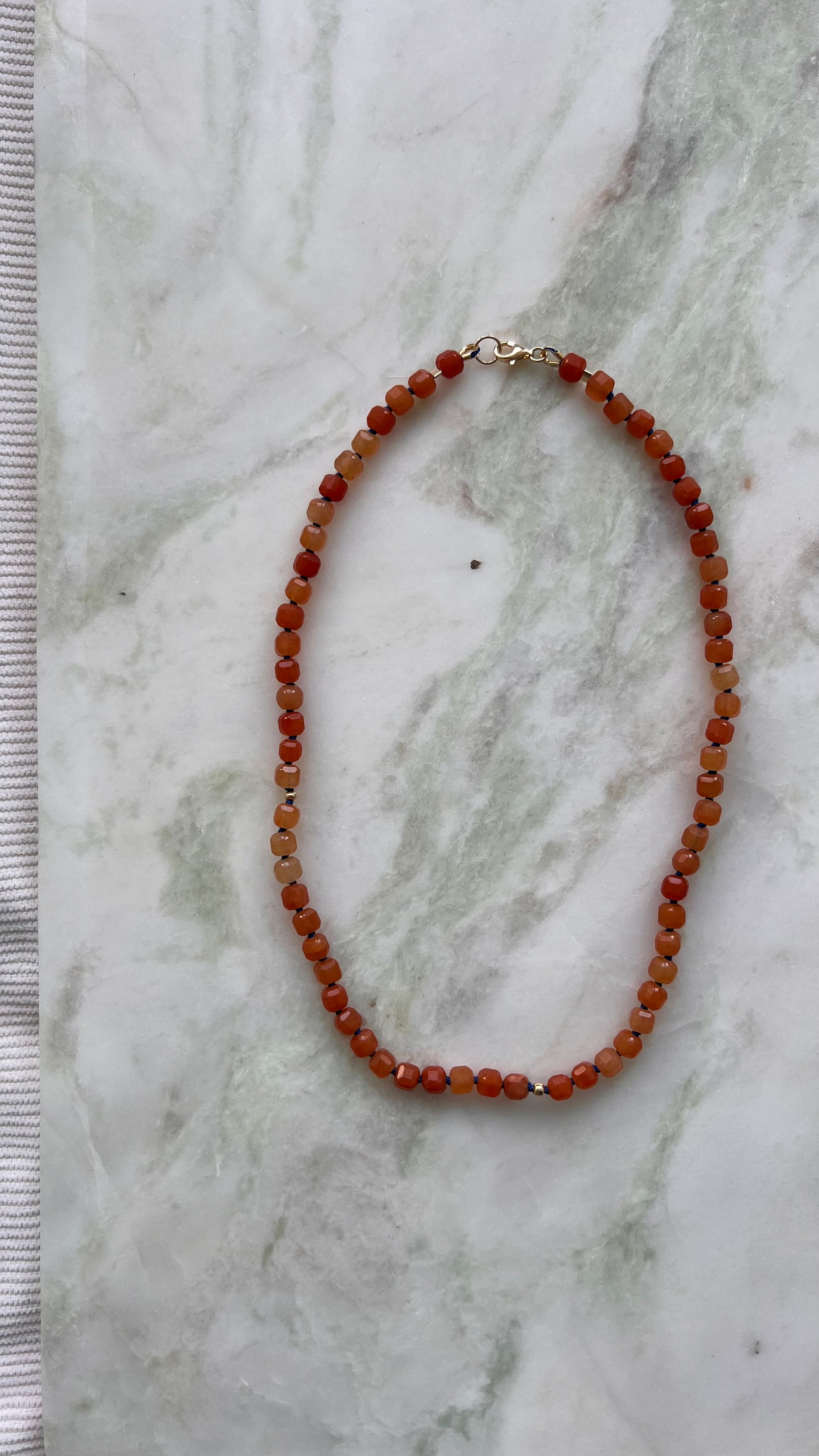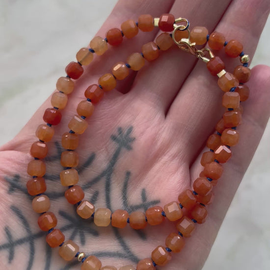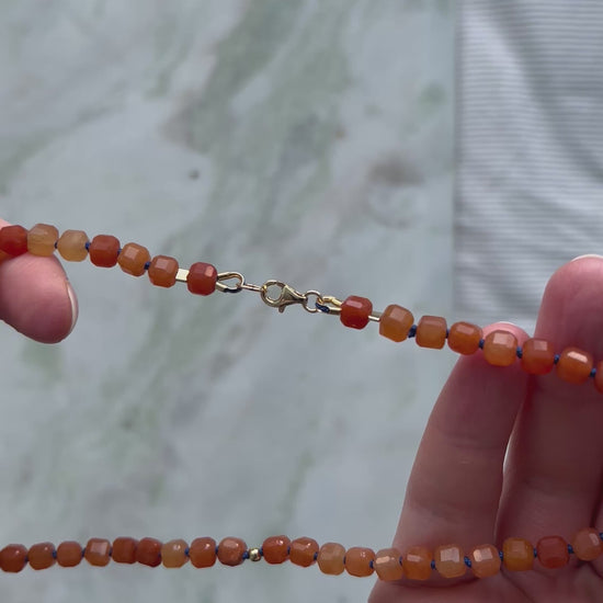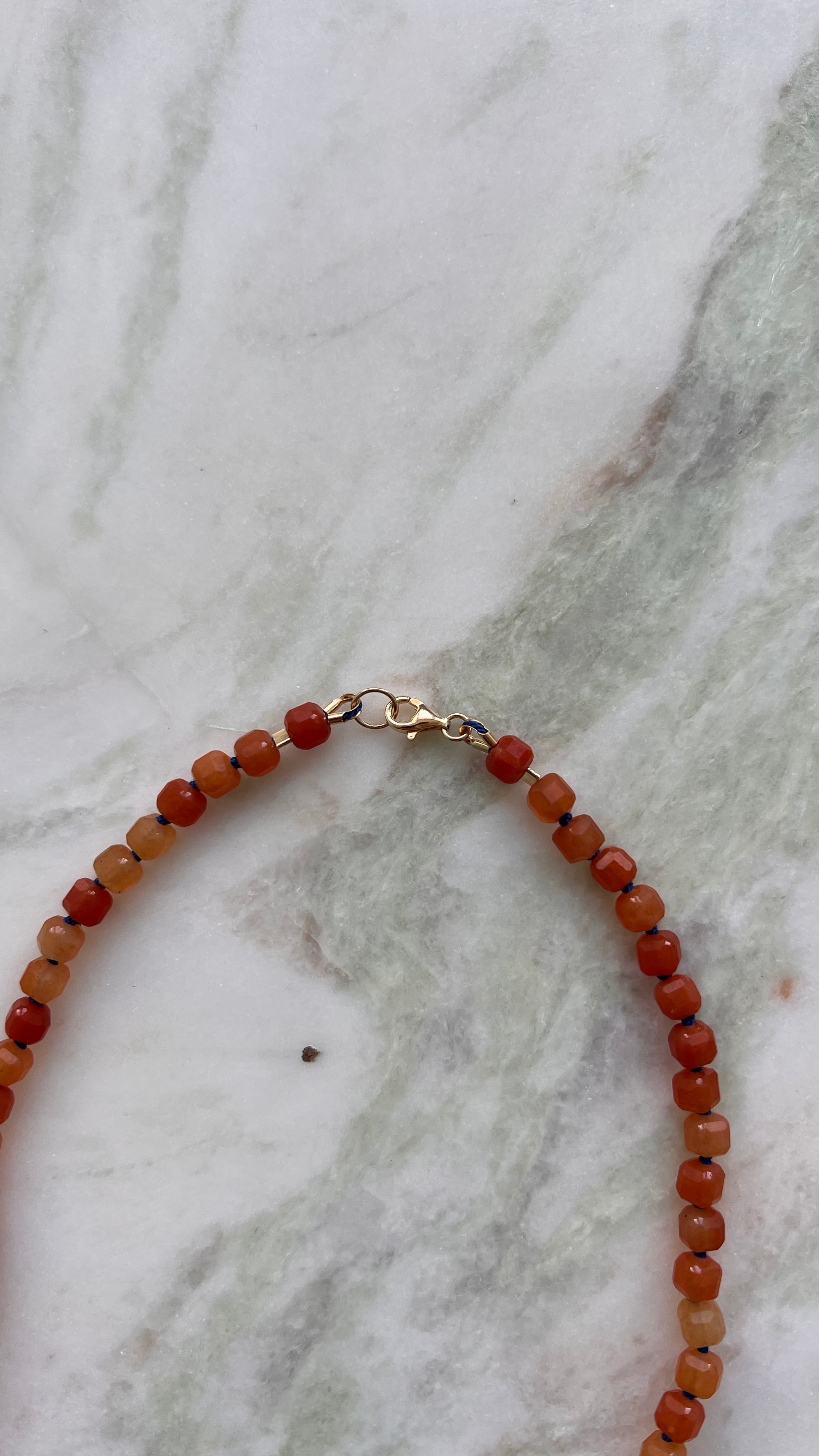 Naszyjnik z pomarańczowego awenturynu w kształcie kostki.