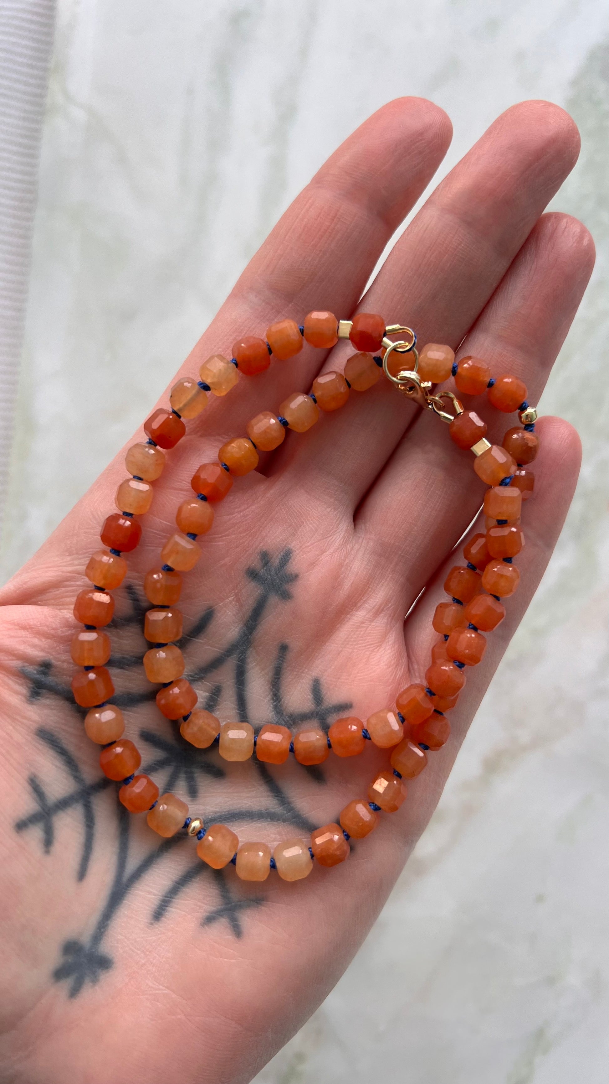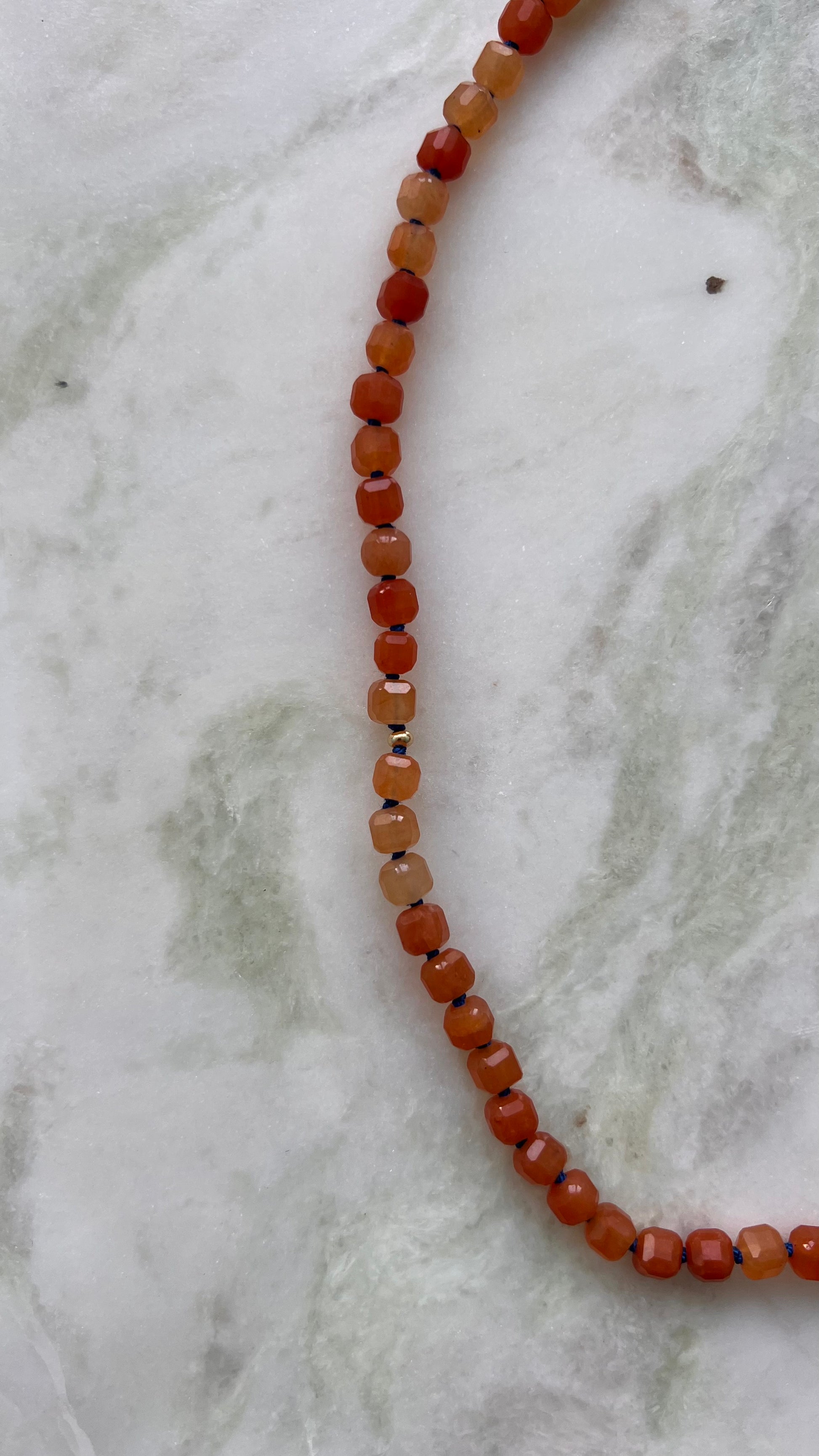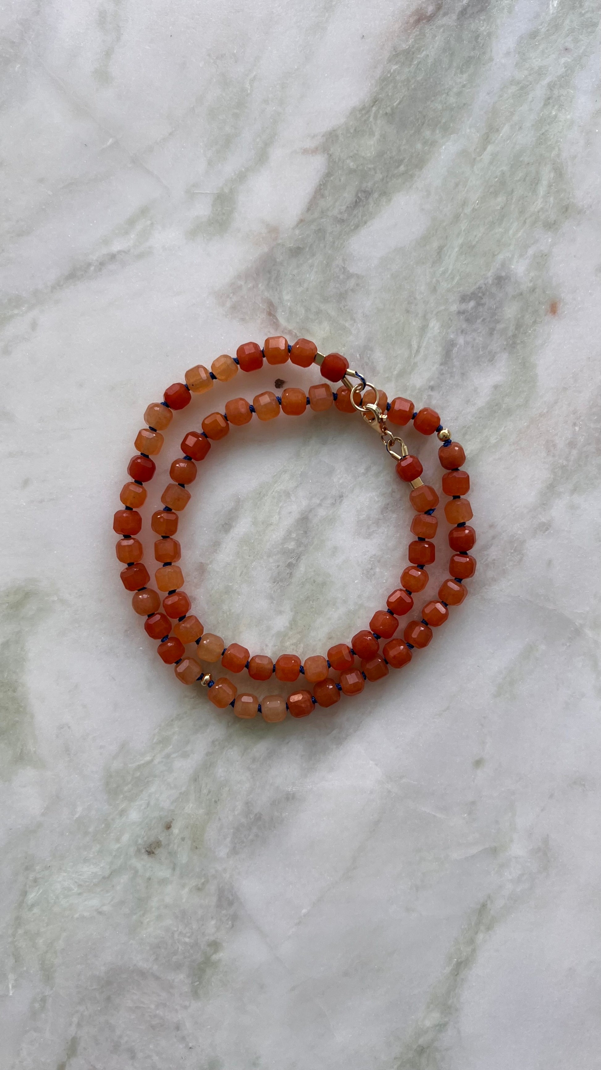 Naszyjnik z pomarańczowego awenturynu w kształcie kostki.