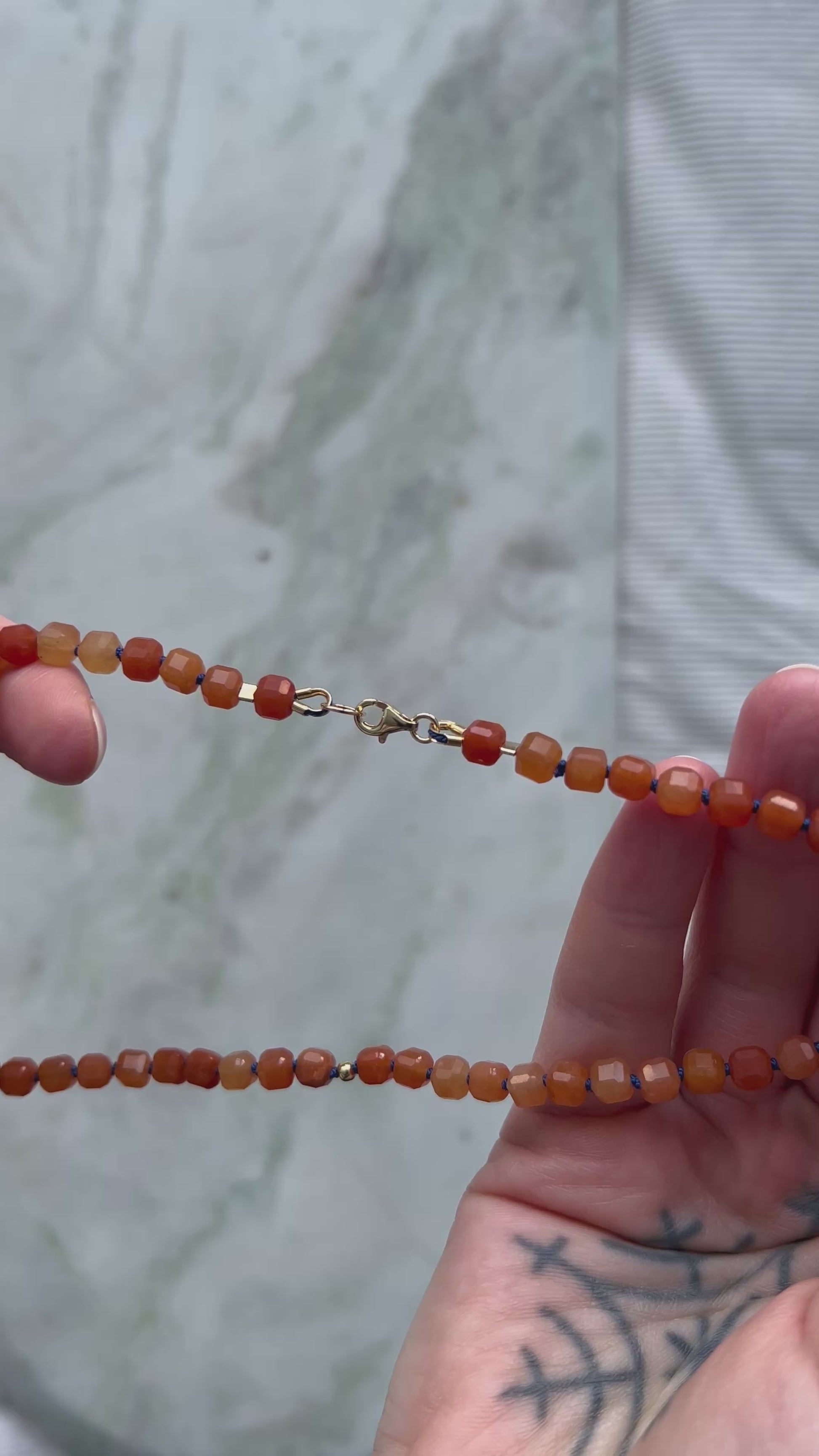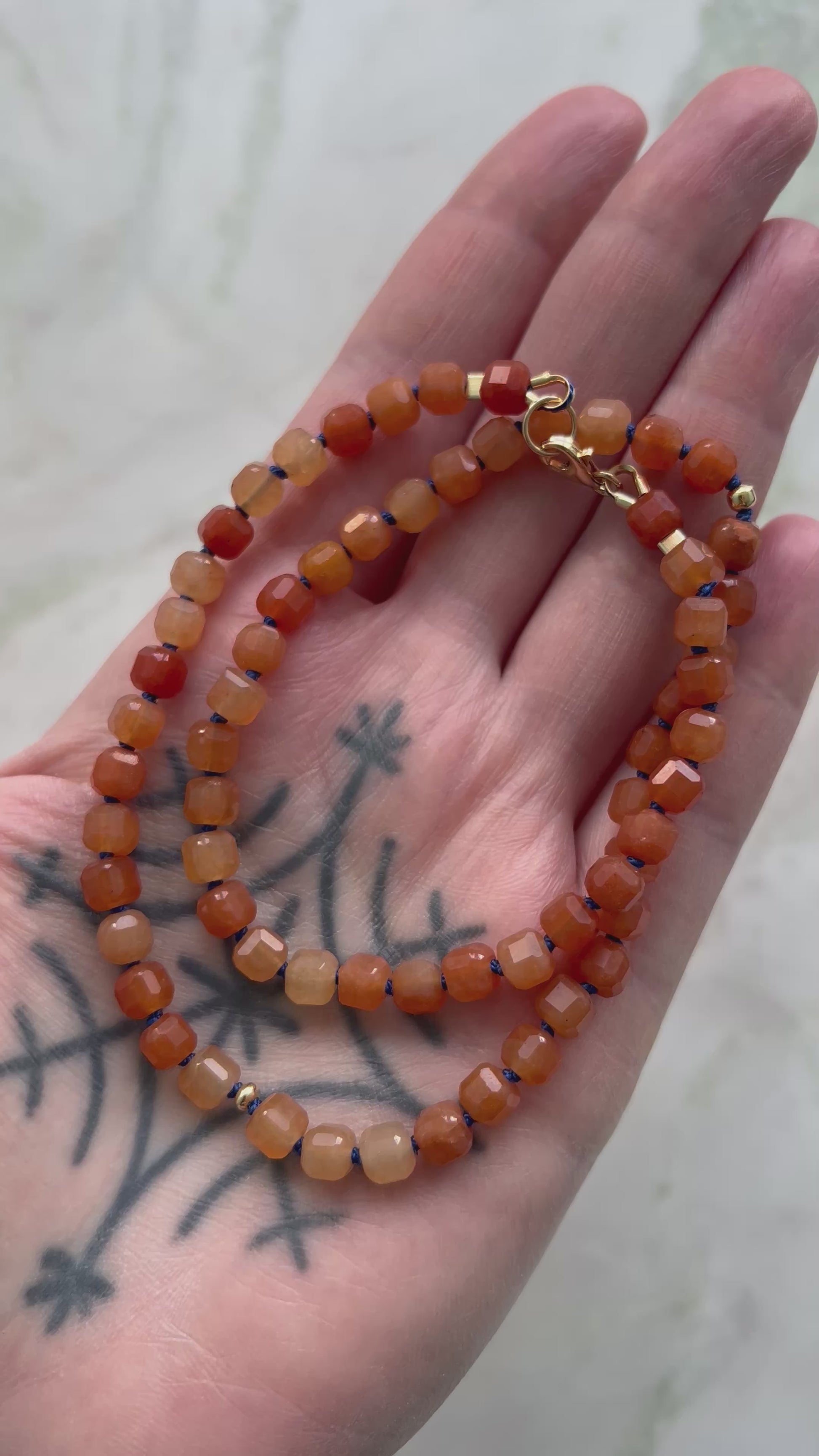Naszyjnik został wykonany z naturalnego kamienia awenturynu (kostka 5,5 x 5,5 mm). Pomiędzy kamieniami znajdują się ręcznie wykonane supełki, dzięki czemu biżuteria jest trwała i elastyczna, a każdy egzemplarz ma swój unikalny charakter.