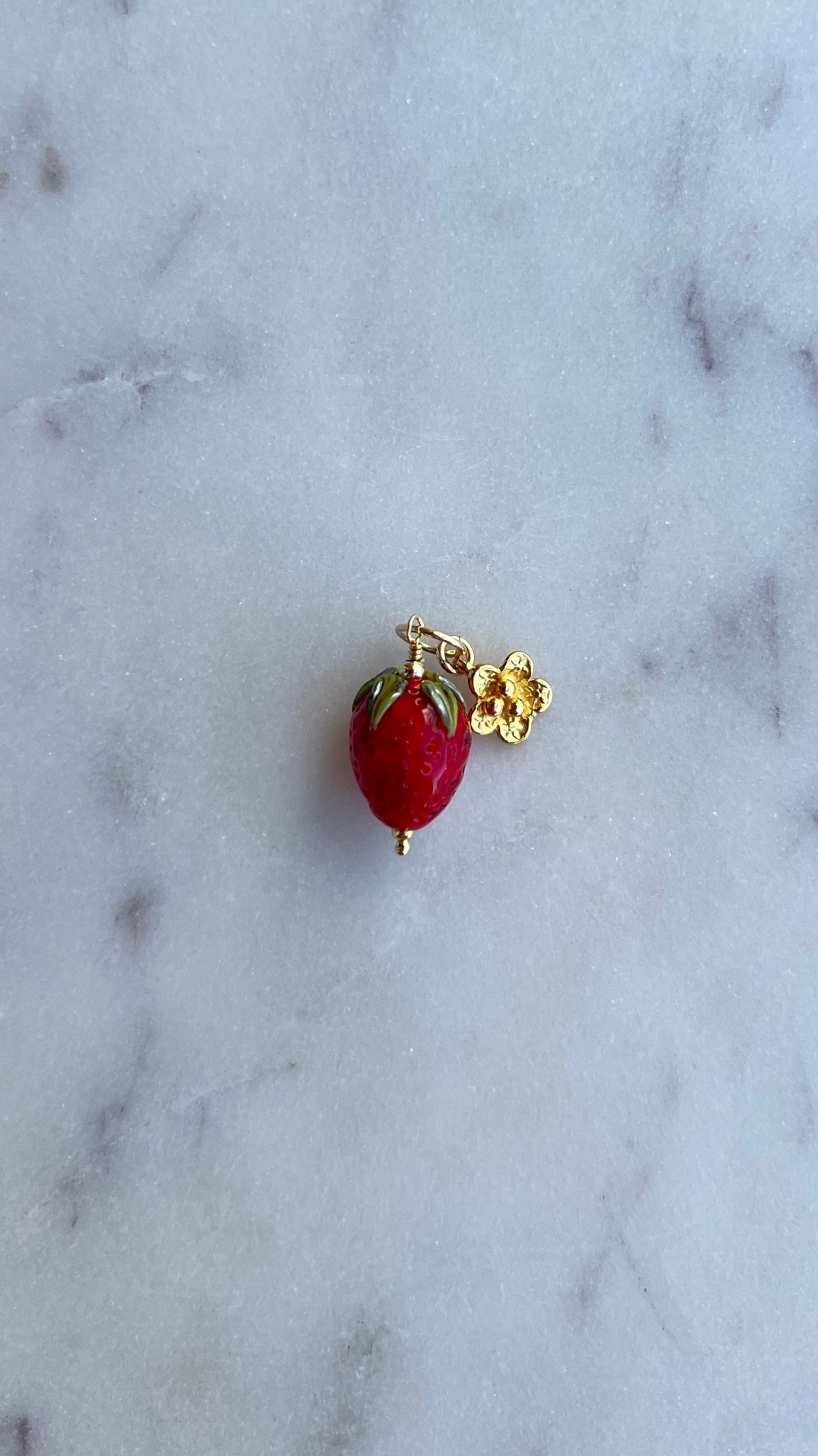 Zawieszka truskawka ze złotym rozkwitającym kwiatem.